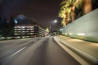 This image captures the vibrant energy of city life in Los Angeles, USA. The photo depicts a road in the city, illuminated by street lights and artificial light. The motion blur effect adds a sense of movement and dynamism. The dark night sky contrasts with the bright lights of the urban landscape. The urban design is evident with the asphalt road and buildings in the background. This photo represents the fast-paced and lively atmosphere of one quarter of Los Angeles at night.