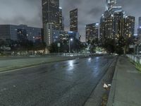 A stunning night view of downtown Los Angeles, with its modern skyscrapers shining under the city lights. The reflection of the cityscape on the wet road adds to the urban charm. The highway entrance and exit ramps create a seamless connection to the bustling metropolis.