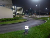A night scene in Los Angeles showcasing urban design and modern architecture. City lights illuminate the curved road, creating an artificial light display. Street lights stand on the grassy road curb, adding to the urban ambiance.
