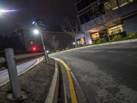 the view from an intersection in the city at night of a traffic light, with a car going by