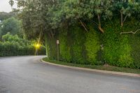 This is an image of a road in Los Angeles, California, USA. The asphalt road is lined with hedges on either side. The picture captures the urban landscape of Los Angeles, showcasing its well-maintained roads and greenery. This photo represents the bustling city life of Los Angeles, with its iconic road infrastructure and landscaped surroundings.