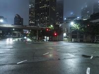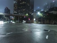 This stunning stock photo captures the iconic Los Angeles city skyline at night, showcasing its modern architecture and reflecting water. The city's vibrant lights illuminate the bustling streets and highlight the urban infrastructure. The foggy atmosphere adds a sense of mystery, creating a captivating and atmospheric view. The image features roads, crosswalks, and stoplights, symbolizing the busy metropolitan area. The coastal location of Los Angeles is evident with water resources, a fountain, and the serene open space. This photo is perfect for illustrating urban life, cityscape, and the dynamic energy of a thriving metropolis.