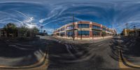 Distorted photograph of an empty city street in downtown Los Angeles. No traffic or cars are present, giving a serene view of the city skyline. The straight road and yellow lines add a sense of motion. A glimpse into the urban design of this metropolis.