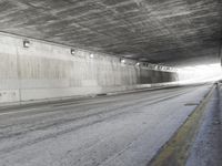 This black and white photograph captures the urban landscape of Los Angeles, California. The image shows an empty highway leading towards a tunnel that appears to be partially blocked off. The straight road, lined with concrete and asphalt, stretches out into the distance. The underpass and the bridge create an interesting architectural feature. The day is well lit, casting light and shadows on the cement walls and wooden structures. This photo represents the infrastructure and road surfaces of the city, showcasing the urban environment of Los Angeles.