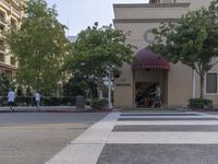 a building that is on the side of a street with people walking in it and some trees