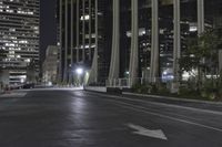 A wide empty street at night in the heart of downtown Los Angeles. The modern architecture of towering office buildings illuminates the cityscape with artificial light. A bustling metropolis in California, USA.