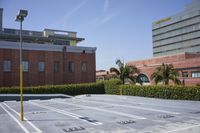 This stock photo features the cityscape of Los Angeles, California, USA. The image showcases a mix of classic architecture and modern buildings in a vibrant metropolitan area. The city is full of diverse neighborhoods, residential areas, and open spaces. The photo captures a sunny day with a clear sky and plenty of green trees. The roads and parking lots are made of asphalt, providing easy access to the different properties in the town. The image also includes a stadium and public spaces for people to enjoy. The classic architecture and clear sky make this photo perfect for real estate or urban-related projects.