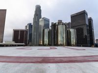 This is an image of a cityscape at dawn in Los Angeles, USA. The futuristic architecture of the high-rise buildings stands out against the clear sky. The open space below is a concrete surface, with an empty parking lot visible. The helipad on top of one of the buildings suggests the presence of a heliport. This modern urban design reflects the business district of the city. The photo captures the break of day in Los Angeles, showcasing the urban landscape and the bustling city life.