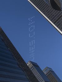 a plane flying in the sky above skyscrapers on a sunny day with jet trails written in the sky