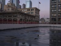 A night view of downtown Los Angeles, California. The cityscape showcases a mix of classic and modern architecture. Brightly lit office buildings and high-rise condominiums reflect on wet city streets. A vibrant urban scene.
