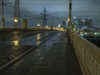 A stunning view of the Los Angeles skyline at night, reflecting beautifully in the wet road. The city's impressive skyscrapers create a breathtaking sight against the dark and gloomy sky. The illuminated city lights, street lights, and overhead power lines contribute to the urban charm. This photo perfectly captures the essence of Los Angeles' urban design and vibrant city life.