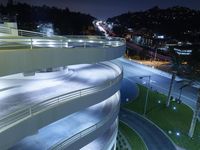 This is an image of a curved walkway going over an elevated bridge in Los Angeles, California. The cityscape is illuminated with artificial lights, creating a vibrant urban scene. Cars can be seen driving down the road, adding movement and energy to the image. The clear sky above provides a contrast to the concrete structures and the elevated design. This photo represents the dynamic architecture and urban design of Los Angeles at night.