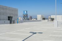 This image captures the dynamic cityscape of Los Angeles, California, USA. The view overlooks a parking lot, with a water tower in the background, against the backdrop of the city skyline and buildings. The urban design features the concrete surfaces of the parking lot and asphalt roads, contrasting with the clear sky above. The photo embodies the hustle and bustle of city life, showcasing the architectural facades and skyscrapers. It also highlights the open spaces and public areas that contribute to the overall urban experience in Los Angeles.