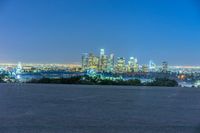 A stunning view of the Los Angeles cityscape at night. The city lights illuminate the dark sky, creating a mesmerizing urban scene. Skyscrapers and modern architecture dominate the skyline. The asphalt roads and parking decks offer a glimpse of city life in California.