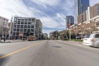 Aerial view of downtown Los Angeles, California. The city emerges with its iconic skyscrapers and sprawling urban landscape. The straight road cuts through the city, lined with bustling streets and lanes. Clouds add a touch of motion to the cityscape.
