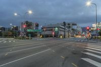 This stock photo features a stunning view of the metropolitan area of Los Angeles, California at night. The city streets are illuminated by street lights and traffic lights, creating a beautiful display of artificial light. The open space of the highway and lanes can be seen, offering a glimpse into the urban transport system. The asphalt road stretches into the distance, leading to the bustling city center. The dark sky above adds to the ambiance of the scene, creating a captivating cityscape.