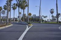 A coastal road in Los Angeles, California. Palm trees line the asphalt while clear blue skies contrast with the yellow caution sign. In the distance, the ocean and sandy beach create a scenic landscape.