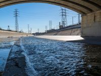 a view of water, electric poles, and street lights under an overpass over a body of water
