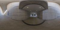 a circular shot looking down a concrete pathway, with circular columns and arches surrounding it