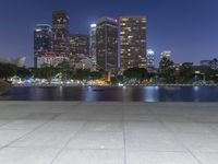 A stunning cityscape of Los Angeles at dawn. The clear sky reflects on the surface of the water, illuminating the city's high-rise buildings and street lights. A perfect blend of nature and urban metropolis.