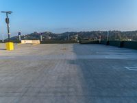 a empty parking lot is shown with hills and a hill in the background during a sunny day