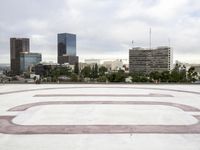 This is an image of a modern architectural building in Los Angeles, California, USA. The white building stands tall against the clear sky, forming a part of the city's captivating skyline. The surrounding area features open spaces, concrete surfaces, and a parking lot. The urban design of this metropolitan area reflects the bustling business district. In the distance, we can see a stadium and a helipad, showcasing the city's vibrant and diverse attractions. This photo represents the dynamic and contemporary nature of Los Angeles.