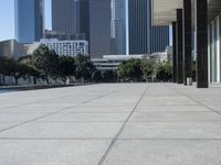 This is an image of a paved concrete sidewalk in downtown Los Angeles, California. The modern architecture of tall buildings lines the street, creating a captivating urban skyline. At the end of the sidewalk, there is a peaceful pond, providing a refreshing open space amidst the bustling city. The clear sky above adds to the vibrant city life. This photo represents the urban design and metropolitan atmosphere of Los Angeles, showcasing the combination of modern architecture and natural elements.