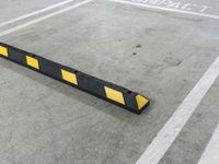 High-angle view of a yellow line on an elevated road surface in Los Angeles, California, USA. The concrete and asphalt pavement contrast with the clear blue sky. A parking lot sign and barrier can be seen in the background.
