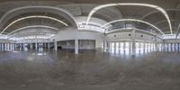 An empty, clean building in the heart of Los Angeles' business district. The long, straight ceiling creates a sense of urban symmetry. Natural light floods through the glass windows, casting shadows and creating reflections. A modern space perfect for an office or studio.