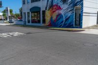 Vibrant street corner in the heart of Los Angeles. Graffiti wall displays a stunning eagle painting, showcasing the city's urban art scene. Clear day sky adds to the colorful atmosphere. Perfect spot to shop, eat out, and explore the art district.