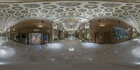 A mesmerizing view of a grand hallway in Los Angeles. The decorative ceilings and elegant interior design showcase the architectural beauty of this California palace. Artificial lights illuminate the dark, creating a captivating atmosphere.