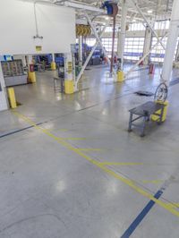 This is an image of an open space interior in Los Angeles, California, USA. The modern architecture of the building features concrete floors and high ceilings. The glass windows allow natural light to flood the space, creating a bright and airy atmosphere. The industrial design includes warehouse elements and exposed surfaces. The room showcases furniture and machinery, reflecting the engineering and manufacturing culture of the city. This versatile space can be adapted for various purposes such as a workshop, car dealer showroom, or even a race track. Experience the urban charm and industrial vibe of Los Angeles in this image.