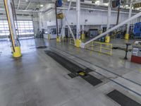 An industrial warehouse in Los Angeles, California. The elevated open space is filled with machinery and equipment. Concrete flooring and steel beams give an urban feel. A day at the factory.