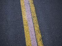 two yellow and pink lines painted on the asphalt in an area that seems to be a street