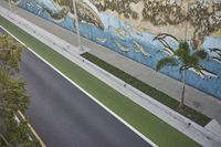 A view of a busy highway ramp in Los Angeles, California. The elevated road surface leads to a high-speed thoroughfare surrounded by green vegetation. The urban design and infrastructure make it a key entry and exit point to the city.