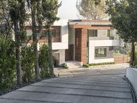 A modern villa situated in a residential area of Los Angeles, California. The sleek concrete facade and landscaped driveway make it an architectural masterpiece. The property boasts a spacious entry and is surrounded by lush trees.