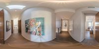 A modern residential interior in Los Angeles, California. The curved room features artwork on the walls, with a yellow stair and wood floor. Natural light shines through the ceiling, creating a warm and inviting living space.