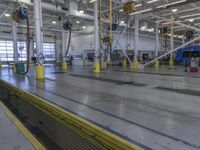 the inside of an industrial warehouse with a conveyor belt and a yellow and blue line