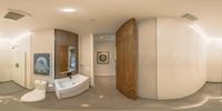 Modern architecture meets nature in this stunning Los Angeles villa. The interior design showcases a spacious living room with yellow accents and a wooden floor. The bathroom features large, round mirrors that add a touch of elegance to the space.