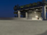 a small white kitchen outside with lights at night time, concrete area and concrete column