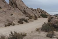 This stock photo features a breathtaking landscape in Los Angeles, California, USA. The image showcases a cloud-filled sky over a sandy desert and dirt road. The majestic mountains in the background add to the beauty of the scene, with their high peaks and rocky outcrops. The rugged rock formations and gravel-covered terrain give a sense of the geology and badlands of the area. Despite the gloomy grey sky, the elevated and sandy streets of Los Angeles can be seen, creating a unique juxtaposition of nature and urban environment.