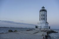 a white lighthouse is standing at the end of the pier overlooking the ocean and the city
