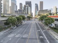 Aerial view of downtown Los Angeles at dawn. Clear skies showcase the metropolitan area's iconic skyline, with towering skyscrapers dominating the urban landscape. Residential areas and infrastructure are visible from this high point of view.