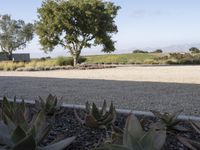 A modern residential villa in Los Angeles, California. Surrounded by open space and rugged terrain, the house is designed with sleek modern architecture. The courtyard features a variety of vegetation, including agave plants and colorful flowers.