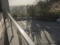 Elevated view from a modern home in Los Angeles, California. Sunrise illuminates the palm trees and open spaces. Contemporary architecture features glass windows, high ceilings, and composite material surfaces.