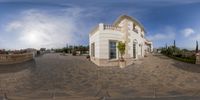 a fisheye photograph of the entrance way and back yard area of a mansion with a patio
