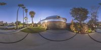 a fisheye view of the front yard and walkway of a residential complex, with a car parked in the driveway next to trees