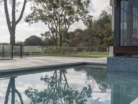 A modern villa in Los Angeles, California, with a beautiful pool reflecting the surrounding trees. The outdoor patio and lounge area make it the perfect sunny retreat. Enjoy the sunshine and relax in this stunning property.