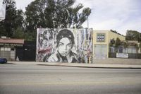 large mural depicting a portrait of prince and holding a cigarette in a street corner with buildings