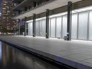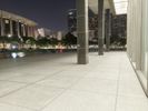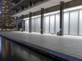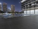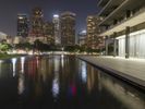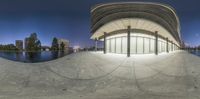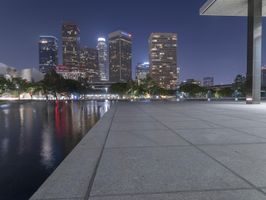 A fish-eye shot of the Los Angeles skyline at night, with city lights reflecting on the water. The open space and high-rise buildings create a stunning cityscape. A true metropolitan experience in the coastal city of California.